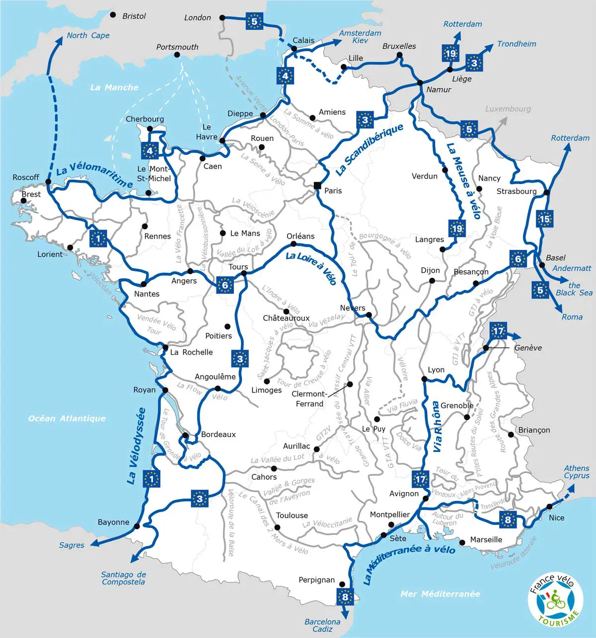 Dix itinéraires européens traversent la France à vélo, de l’Atlantique aux Alpes, des plages du Nord aux villages du Sud.