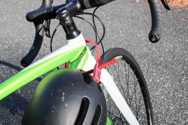 Le Click Lock ne paye pas de mine au premier abord. Un câble fin de 45 cm, une fermeture à code 3 chiffres, une silhouette inspirée des colliers de serrage qu’on utilise pour attacher des câbles… Pourtant, Kryptonite ne l’a pas conçu comme un simple gadget. Le câble intègre un cœur en acier de 10 mm, ce qui le rend plus résistant qu’un simple lien plastique ou textile. Aucun niveau de sécurité n’est indiqué, car ce n’est pas sa vocation. L’objectif reste clair : protéger les accessoires (casque, sacoche, voire les roues) ou dissuader un vol opportuniste lorsque le vélo reste en vue.