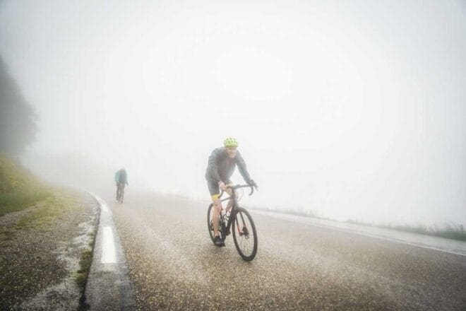 Le plus frustrant ? Voir d’autres participants mettre pied à terre et continuer à pied. L’envie de faire pareil m’a traversé l’esprit plusieurs fois, mais je voulais vraiment aller jusqu’au bout. Heureusement, je roulais aux côtés d’un cycliste que je connaissais, ce qui m’a donné une motivation supplémentaire. Et puis finalement, après ce qui m’a semblé être une éternité, on est arrivés en haut… sous la pluie, dans le froid et le brouillard. Mais on l’a fait !
