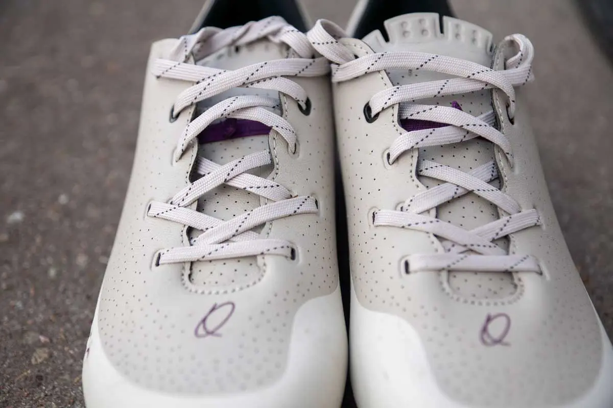 Le premier contact visuel avec la Gran Tourer XC Lace confirme ce que j’avais ressenti à Eurobike : Quoc place la barre haut sur l’esthétique. Cette teinte Chalk – un blanc cassé légèrement vanillé – est rehaussée de détails violets qui tranchent juste ce qu’il faut. Le logo discret, les perforations dessinées avec soin, les surpiqûres nettes : chaque détail respire la sobriété et l’élégance. C’est beau, c’est propre, presque luxueux. En plus, la paire est livrée avec son petit sac en tissu assorti et une paire de lacets supplémentaire.