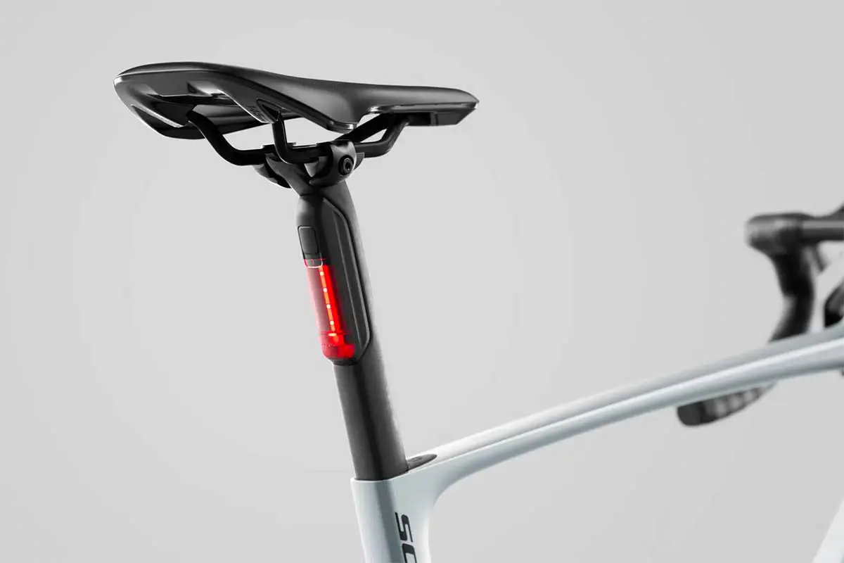 Autre point bien vu : la tige de selle en forme de D, héritée de l’Addict RC, fait désormais partie de l’ADN du modèle. Non seulement elle renforce le confort sans sacrifier la rigidité, mais elle permet aussi d’y installer une version avec éclairage arrière intégré, pour rouler visible sans rien ajouter au vélo. Même logique côté collier : le serrage rond traditionnel laisse place à un système intégré plus discret, plus élégant et mieux aligné avec le design du cadre.