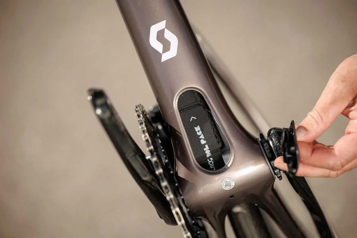 L’Addict 2026 embarque aussi un kit de réparation intégré dans le tube diagonal (pompe, chambre, démontes-pneus), avec accès discret sous le cadre. Réservé aux versions haut de gamme (Addict Premium et Addict 10), ce module est disponible en option sur les autres. Autre nouveauté : une sacoche Syncros fine et ajustée au triangle avant, fixée via des points d’ancrage discrets. Facile à retirer, accessible d’une main, elle permet d’embarquer veste de pluie, snacks ou téléphone. On est encore loin du bikepacking, mais clairement dans l’esprit « sorties longues sans sac à dos ».