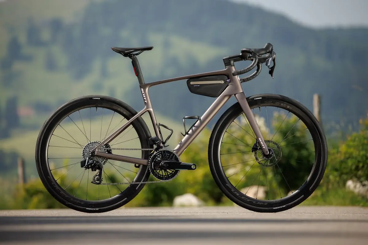 C’est sans doute l’évolution la plus visible. Le nouvel Addict est livré avec des pneus de 34 mm de série, et peut accueillir jusqu’à 38 mm. Un changement qui va bien au-delà du détail technique : c’est un vrai tournant dans la philosophie du modèle. Loin des gommes en 25 ou 28 mm qu’on voyait encore récemment sur les vélos endurance, Scott embrasse clairement le confort et la polyvalence.