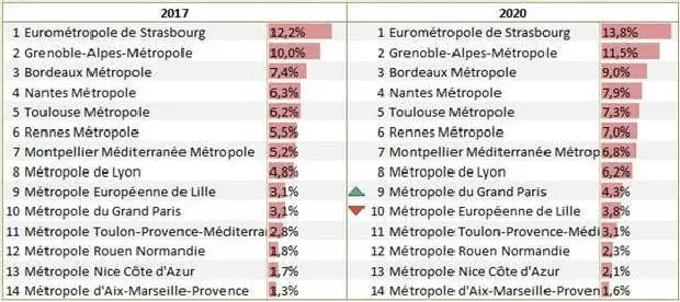 L’étude de l’Insee montre que la part des déplacements domicile-travail à vélo a augmenté de manière significative entre 2017 et 2020. En effet, sur cette période, l’Eurométropole de Strasbourg a enregistré une hausse de 1,6 point pour atteindre 13,8% des déplacements à vélo en 2020. La ville de Strasbourg a quant à elle connu une progression encore plus marquée avec une augmentation de 17,8% des trajets réalisés à vélo.
