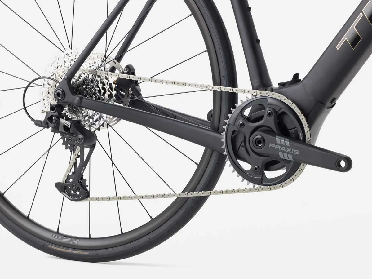 Au cœur du Domane+ ALR, Trek a intégré le dernier moteur TQ HPR60. Un choix stratégique : plus léger, plus silencieux, plus discret que son prédécesseur, ce moteur central délivre un couple de 60 Nm et une assistance jusqu’à 25 km/h. Il ne pèse que 1,9 kg, ce qui permet à l’ensemble du vélo de rester sous les 14,5 kg. Un vrai atout pour un VAE de route.