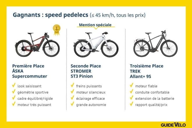 Dans la catégorie e-bike Economy, c’est le Stella Morena MDB3 FI qui remporte la première place grâce à son moteur souple et sa puissante batterie. Le Moustache Samedi 28.7 Open se hisse au sommet de la catégorie Premium avec une maniabilité et une manœuvrabilité exceptionnelles. Chez les speed pedelecs, l’ÅSKA supercommuter, un acteur belge émergent, se démarque par son design audacieux et ses performances notables. Regardons plus en détails les résultats.