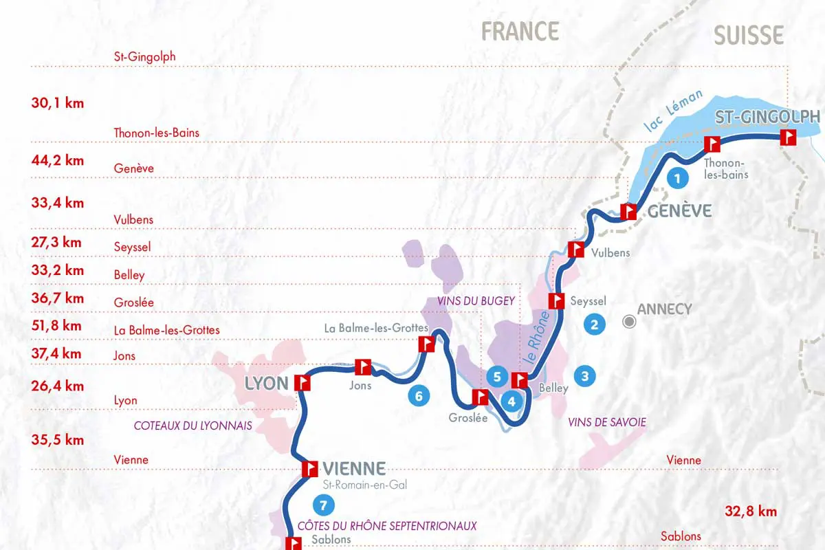 Avec ses 25 étapes « officielles », la ViaRhôna déroule un itinéraire qui change sans cesse de décor tout en restant accessible. Voici les grandes séquences du parcours, de Saint-Gingolph (74) au bord du Léman jusqu’à la Méditerranée.