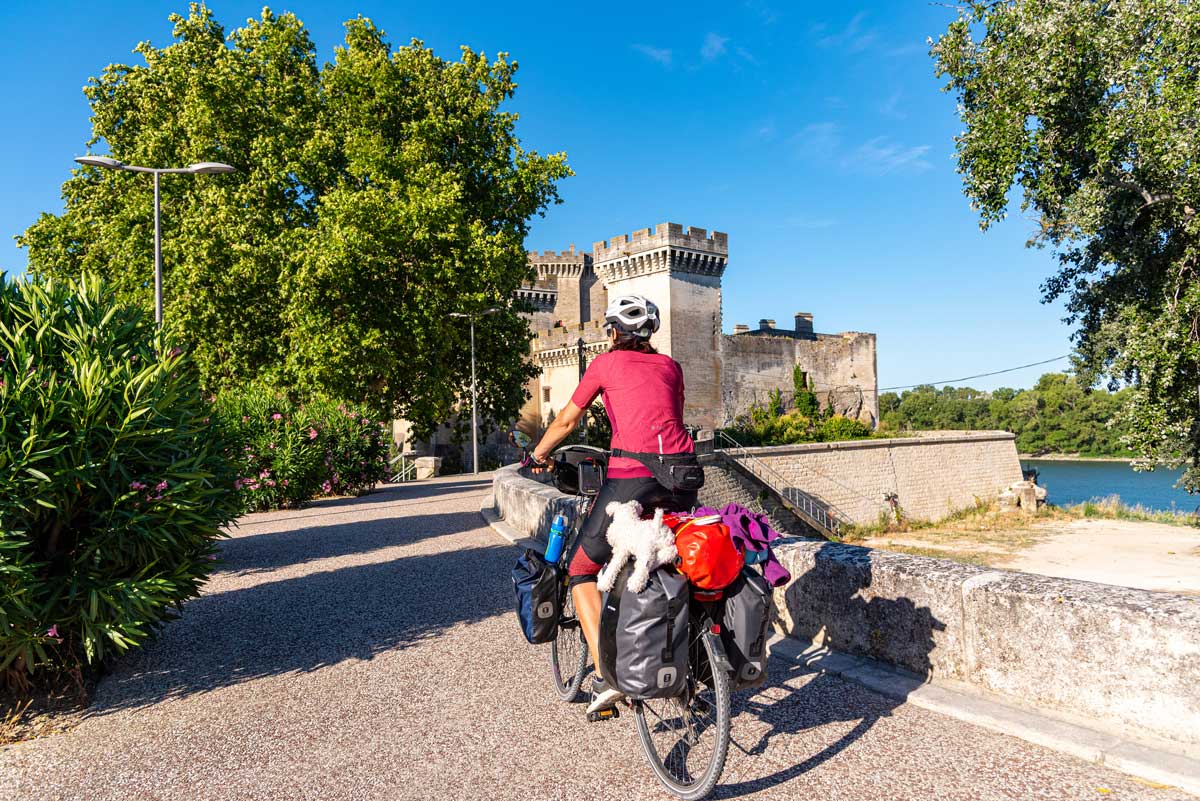 Au sud de Valence, l’ambiance devient plus méridionale. La véloroute alterne entre rive ardéchoise (via Le Pouzin, Cruas, Viviers) et rive drômoise, tout en gardant le fleuve comme fil conducteur. Les paysages s’ouvrent sur les champs de lavande, les collines calcaires et les villages perchés. On passe par Lapalud, puis Caderousse, juste avant d’atteindre Avignon. C’est ici qu’a été installée la première portion de piste cyclable solaire de France.