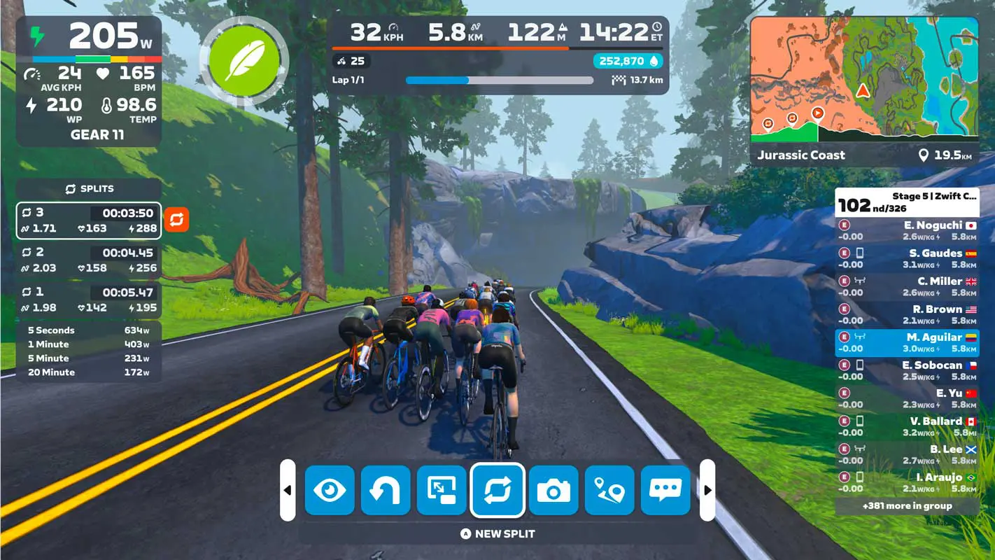Les zwifteurs auront aussi accès à leurs puissances critiques sur différentes durées (5 secondes, 1 minute, 5 minutes, 20 minutes), et pourront personnaliser l’affichage dans le coin supérieur gauche. L’interface inclura désormais la puissance pondérée, l’équilibre gauche-droite, la moyenne en watts par kilo ou encore la température corporelle et le Heat Strain Index, à condition d’utiliser un capteur CORE compatible.